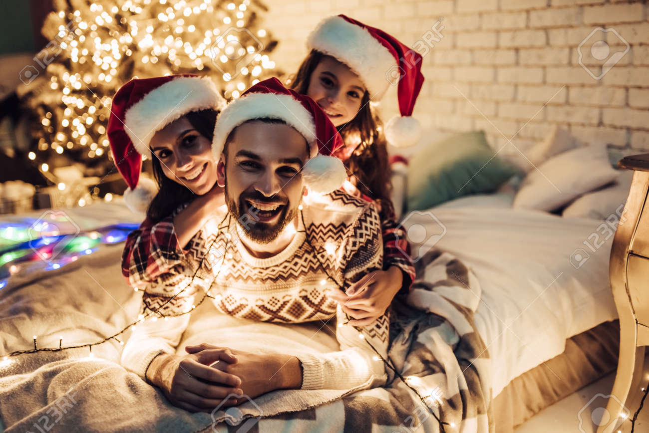 Feliz Natal E Feliz Ano Novo! A Família Feliz Em Chapéus De Papai Noel Está Encontrando-se Na Cama Perto Da árvore De Natal Bonita. Desfrutando De Estar Juntos Na Véspera De Ano