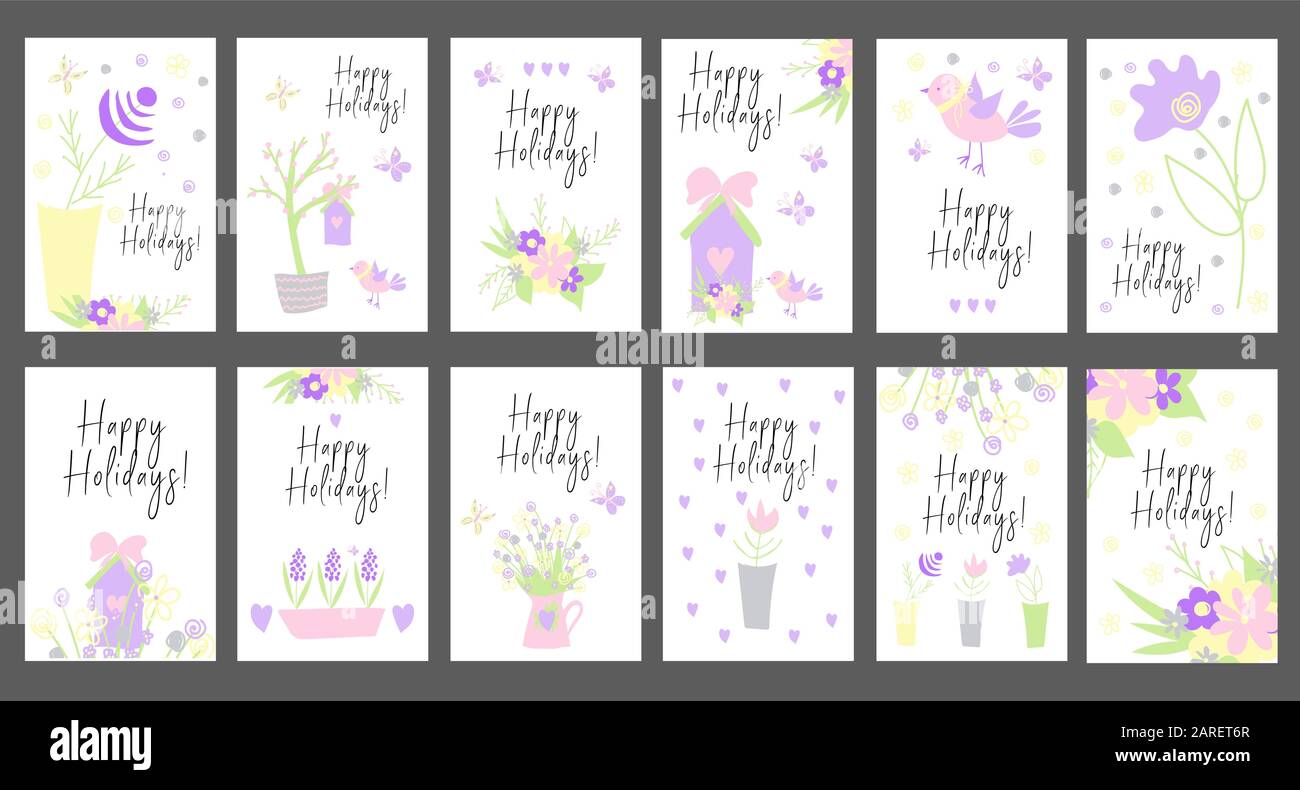 Juego de tarjetas brillantes. Felices Fiestas. Estilo para niños. Ilustraciones sencillas. Lindos personajes kawaii. Flores y banderas de primavera. Colección de aves Imagen Vector de stock - Alamy